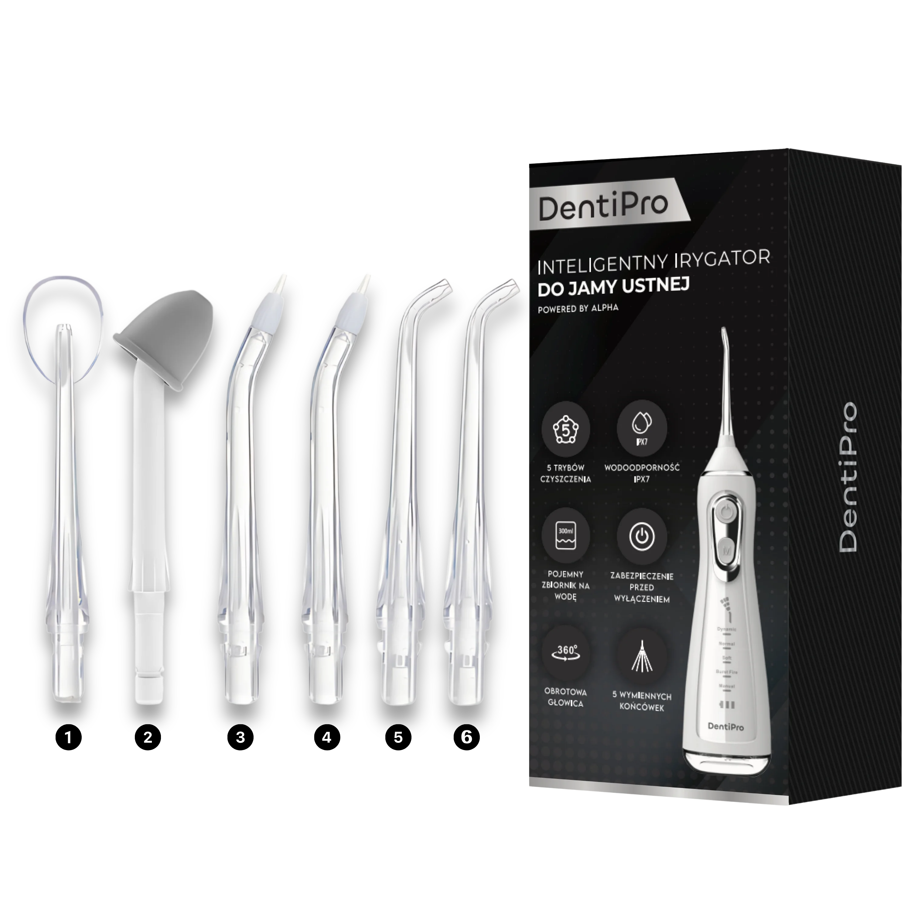 - 5 wymiennych dysz (standardowa, ortodontyczna, do płytki, do języka, do nosa)
